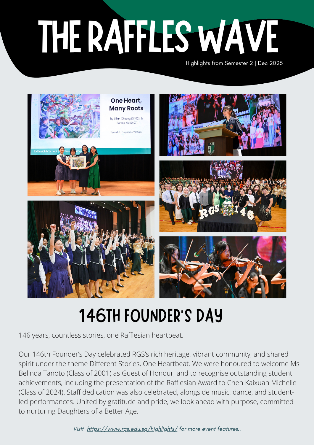 We are pleased to share the December 2025 edition of The Raffles Wave. This bi-annual publication captures highlights from Semester 2, featuring milestone events such as Founder’s Day, as well as a heartfelt reflection by Rafflesian Awardee Michelle Chen Kaixuan (Class of 2024).
